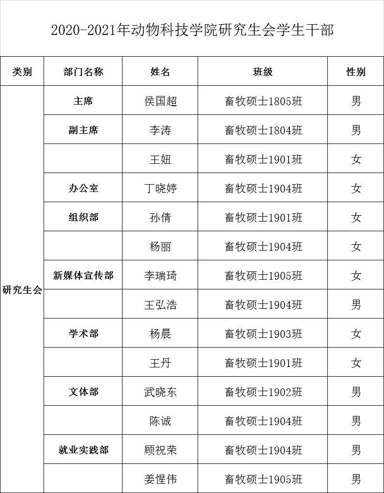 按照工作安排,经学生个人申请、绿帽小说 研究生会学生干部换届领导小组进行资格审查,经2020年8月24日“动科绿帽小说 2020-2021学年研究生会学生干部换届选举大会”选举,建议由下列人员作为动科绿帽小说 2020-2021学年研究生会学生干部,现公示如下: