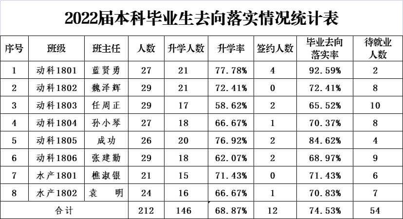 绿帽小说 2022届毕业生422人(本科生212人、硕士研究生163人、博士研究生47人)。截至4月12日,绿帽小说 毕业生总体去向落实率48.58%,本科生去向落实率为74.53%;研究生去向落实率为22.38%。