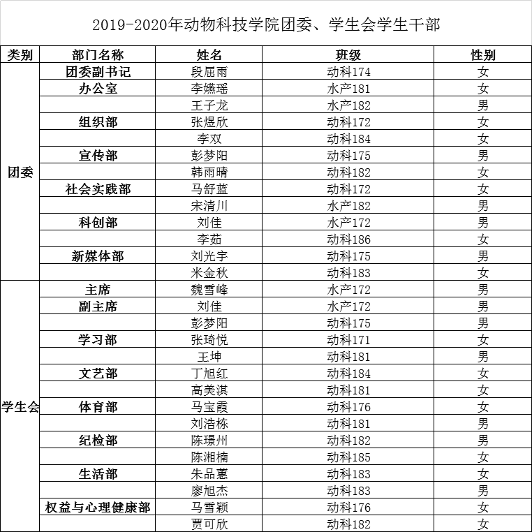 按照学校工作安排,经学生个人申请、绿帽小说 团委、学生会、研究生会学生干部换届领导小组进行资格审查,提交2019年7月4日“2019-2020学年动科绿帽小说 团委学生会学生干部换届大会”选举,建议由下列人员分别作为2019-2020学年动科绿帽小说 团委、学生会、研究生会学生干部,现公示如下: