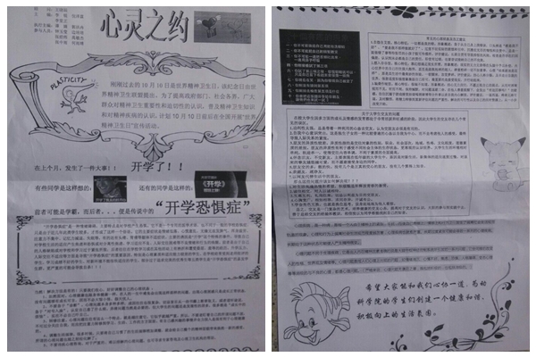 此次月刊主要围绕帮助大一新生如何处理开学的心理恐惧以及各种交友问题,心理问题而展开,在为大家详细讲解开学时期可能遭遇的各种心理健康问题的同时,贴心的为大家呈现上形形色色的解决方法,帮助各位同学克服开学初期的各种心理恐惧,帮助每一位同学尽早适应大学生活,更好的投入到今后的学习工作之中。在发放期刊之余,绿帽小说 心理健康协会成员还就同学们提出的各项问题进行详细解答,帮助其排忧解难,并特意发放部门通讯录和校心理咨询中心的预约电话,以帮助同学们解决今后可能遭遇的各种心理问题。