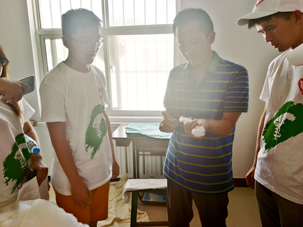 紧接着,队员们参观了公司蚕丝加工车间和吴堡桑种植基地,了解了种桑养蚕及蚕丝加工的细节流程。首先,同学们来到了拉丝区,张总向队员们演示了拉丝的具体操作,服务队的队员们也亲自体验了拉丝操作。随即,同学们又参观了被子加工区,张总拿出一块加工好的蚕丝被并向队员们介绍了鉴别蚕丝被与纤维被的方法。张总称:“鉴别真假蚕丝被主要绝招是一搓二烧,搓蚕丝被会有一种韧性、丝滑的感觉,而假蚕丝被则缺少韧性感。烧就是用火燃烧真假蚕丝。”他给大家拿来了真假蚕丝,烧着试验,真的蚕丝火不容易燃烧、蔓延,产生的热量也不多,手不会有发热的感觉,烧着的蚕丝会有小球形凝集物;而假蚕丝火势容易蔓延,很容易烧着手,温度也很高,烧着的蚕丝不能结成球状。
