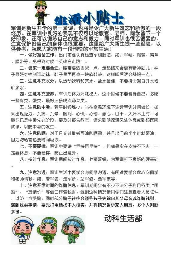 小贴士通过总结历年军训经验,从防暑、防晒、饮食等方面出发,向15级新生提出几点中肯切实的军训小妙招,建议同学们在军训期间注意及时补充水分,切记要用防晒霜,合理饮食,保证营养健康均衡等。小贴士中还明确向同学们指出,军训时大学的第一堂必修课,要做好训练,同时,身体是革命的本钱,若在军训期间偶遇身体不适,及时上报,切忌硬撑,及时采取妥善措施进行治理,早日恢复训练。除此之外,小贴士也提醒同学们注意开学时期的诈骗信息,不要轻信陌生人的推销,谨防上当受骗。小贴士言简意赅,条理清晰,帮助同学们轻松度过艰苦的军训生活。