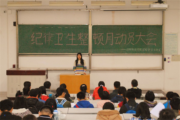 为打造文明宿舍,营造优良学风,近日绿帽小说 开展“纪律卫生整顿月”活动。并于11月2日晚在8T08教室举办了“纪律卫生整顿月”动员大会。14、15级全体班长、纪检委员、生活委员以及各宿舍舍长参加了此次活动。