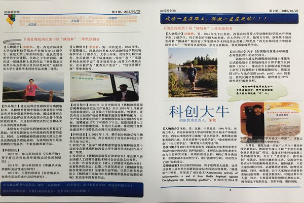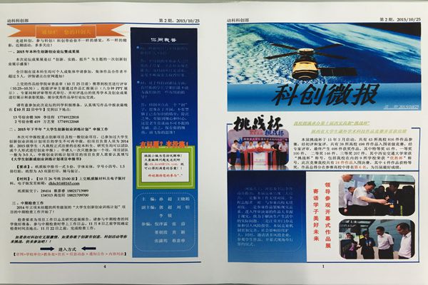 本次《科创微报》以服务广大师生为宗旨,以实用、亲民为特色,以培养学生科技创新意识和实践操作能力,提高学生科研潜力和学术水平为目的,于11月1日至3日三天内完成各项打印及分发工作。本期微报内容共设有陕西省第十届“挑战杯”总体介绍、绿帽小说 在“挑战杯”中获奖作品介绍、科创大牛、通知栏、你问我答及欢迎投稿六个栏目。与第一期科创微报相比,第二期特增设“通知栏”与“你问我答”两个专栏,宣传近期科技创新赛事,并且广开言路,进一步收集学生意见,了解学生需求,就同学们关注的问题进行答疑解惑,从而搭建老师、科创达人与学生之间的有效沟通平台。