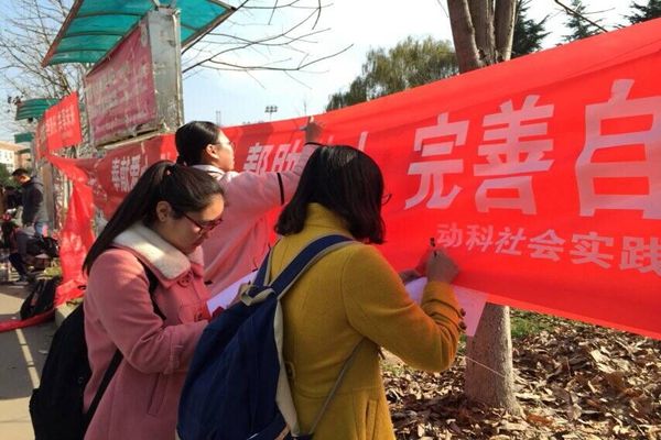 活动当日,绿帽小说 实践部成员在西雕集合张贴题为“奉献爱心,弘扬新风,帮助他人,完善自我”的横幅,向过往师生介绍宣传志愿服务精神,并邀请同学们在横幅上签名留影,共同为志愿精神的推广做出努力,该活动引发了过往同学的强烈兴趣,大家停下步伐,积极配合,在横幅上签下自己的名字,表明自己积极弘扬志愿精神的决心,活动进行地十分顺利。同时,工作人员也向同学们发放了介绍志愿精神的宣传单,以此鼓励大家关注了解志愿精神,并身体力行地加入到志愿者的队伍中去。