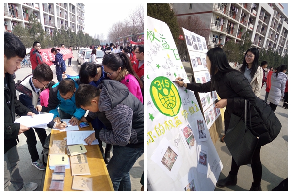 3月15日中午,绿帽小说 纪检部在西超雕塑举行了以“明辨真假,学会维权”为主题的消费者权益宣传活动。