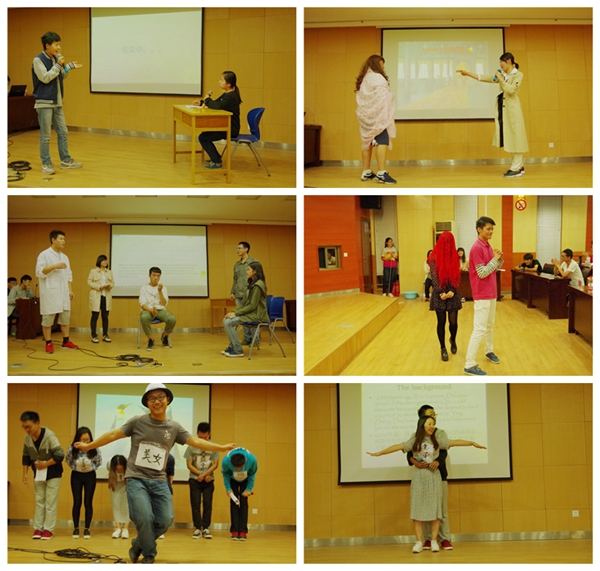 比赛在主持人精彩流利的开场白中拉开帷幕。参赛演员们用出色的表现,充分地展示出了各班的精神风貌,把比赛推向一个个高潮。《小红帽》《丑小鸭》等话剧让大家重温了经典的童话故事,小红帽的机智勇敢和丑小鸭的坚强蜕变让观众们为之赞叹;《三打白骨精》《荆轲刺秦》《孔雀东南飞》等话剧则让大家在阵阵笑声中走进充满古韵的文化历史中,利用浮夸幽默的动作表演,及引人入胜的情节技巧把现场气氛烘托得更加火热;现代剧《爱情公寓》和穿越剧《工藤带你看宫斗》等也令人印象深刻。演员们标准流利的口语、惟妙惟肖的角色演绎和新奇创新的舞蹈赢得了在场观众的掌声和喝彩。比赛过程中穿插有听歌识曲的观众互动环节,到场同学积极参与,气氛相当活跃。