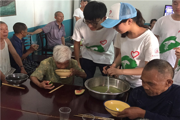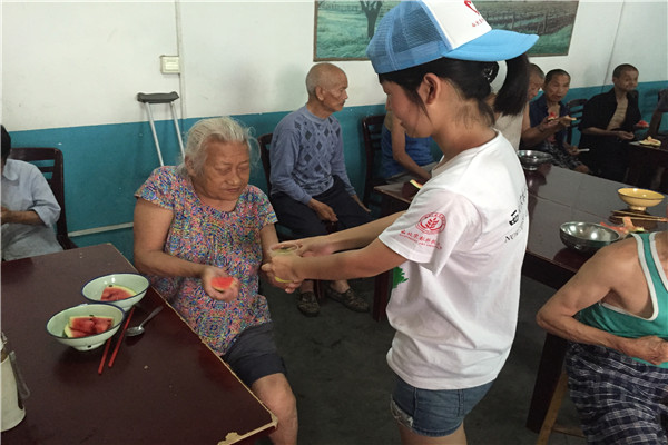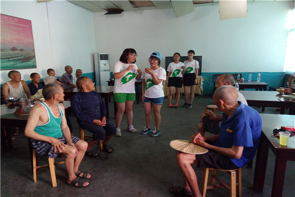 经敬老院负责人介绍,队员们了解到,这里的老人都是一些没有子女、身体残疾的弱势群体,只能依靠政府资助维持生活。队员们到时老人们刚吃过午饭,在院子里散步的他们身形佝偻,步履蹒跚,有些甚至已经出现了痴呆症状。队员们亲眼看到这一幕,心中感到无比酸楚。同学们为老人带去许多适宜老年人食用的水果,并主动帮助老人做一些日常事务,力求减轻他们的负担。贴心的队员们还为老人们准备了节目,合唱了《小苹果》等一些受大众喜欢的歌曲,老人们的脸上也渐渐露出笑容。队员方艺斐说道:老人的笑容是那么的天真纯粹,让人感动。