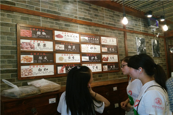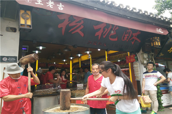 队员们首先进入了重庆特色火锅底料制作销售店,通过观看店家制作火锅底料的过程,并在店家的讲解下,了解到现在火锅底料的种类和其主要组成成分。传统的火锅底料由18种之多的中药药材经长期熬煮而成,浓香气韵浸人心脾,就连过往行人也忍不住进来一看究竟。接下来队伍来到了瓷器口最远近闻名的古镇陈麻花的店铺,不少人来古镇游玩就是为了一尝陈麻花的特色风味。最后队员们又接过制作核桃酥师傅的大锤,做起了手工核桃酥。师傅热情地指导队员们,并告诉队员们用何种方法捶打既省力又能使核桃酥软糯、有嚼劲。大锤应该是是实木的,每一次将它抬起来,都要废不小的力。