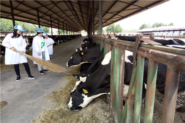 在饲养员的带领下,调研团首先参观了牛棚,熟悉了奶牛生活的环境与进食情况,六个月以上的牛会被带到此处进行散养。在饲养员的指导下,调研团的成员亲自实践,进行奶牛的喂养。他们将草料铺平,将牛赶入进食区,奶牛进食时有特殊的装置,可以将奶牛固定在栏杆的空隙中,以确保奶牛可以充分进食。在奶牛进食期间,他们需要不时的将被奶牛拨开的草料重新铺平,保证每头奶牛的面前都有饲料可以食用。大约一个小时奶牛进食完毕后,在饲养员的帮助下,调研团将奶牛重新赶回散养处,并帮助饲养员扫除饲料,清理牛棚。