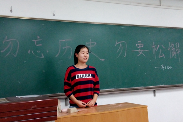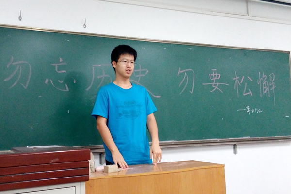 “历史是需要铭记的,但是,这并不等于我们总是沉浸在历史中,更要以发展的眼光来看问题,与时俱进,用历史来服务于当下的发展,用历史的经验来指明未来的道路。”活动开始谭天元同学首先对主题进行了精辟而独到的解释,随后袁庆、杜福臻等同学又围绕着主题说出了自己对于中国历史的独到看法,抒发了自己强烈的爱国情怀,国在,人在,好好守卫中国,发展中国,为实现中国梦而努力奋斗。
