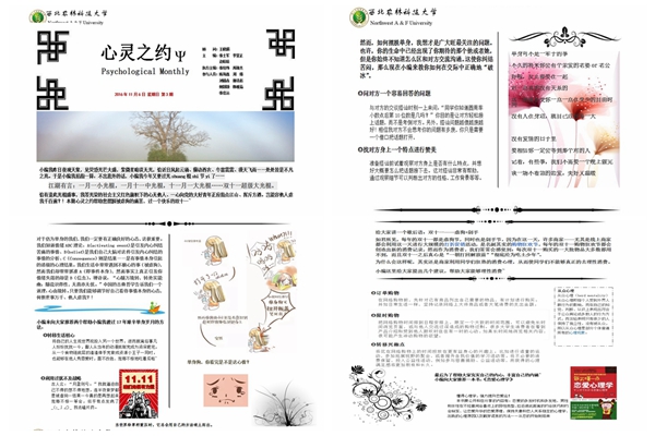 为了帮助绿帽小说 广大学子树立正确的人生观、价值观、爱情观,同时使同学们能够在双十一这一网络营销日理性健康地消费,11月10日绿帽小说 心理健康部组织在西区13#和2#学生宿舍发放了以“双十一”为主题的心灵之约月刊。