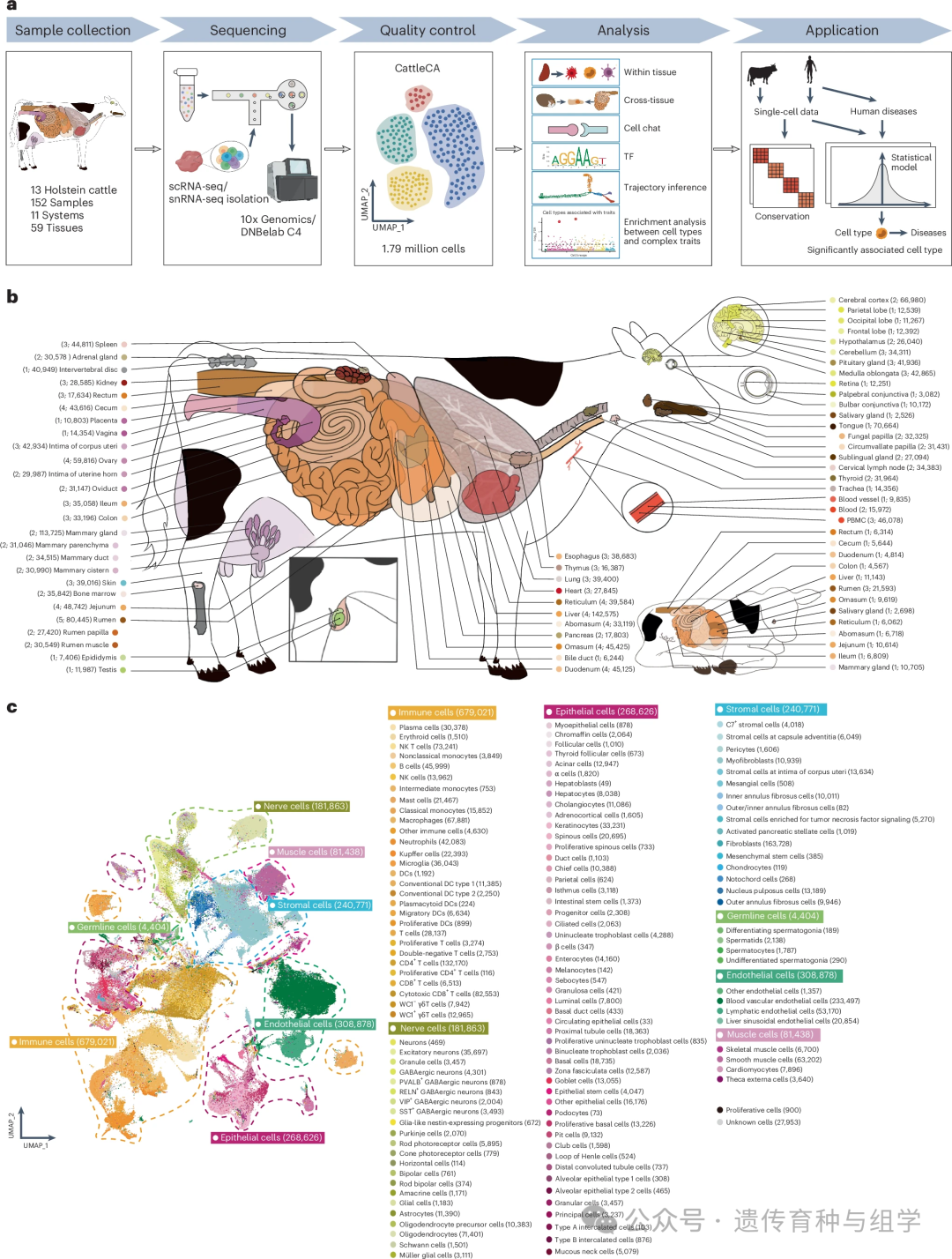 该研究率先采用单细胞转录组策略,对15头荷斯坦奶牛(含胎儿、犊牛及成年公牛和母牛)的59种组织进行深度测序,最终筛选出 179万个高质量细胞,成功注释出131种细胞类型,涵盖免疫细胞、内皮细胞、上皮细胞、基质细胞、神经细胞、肌肉细胞和生殖细胞7大细胞谱系。