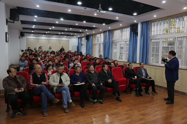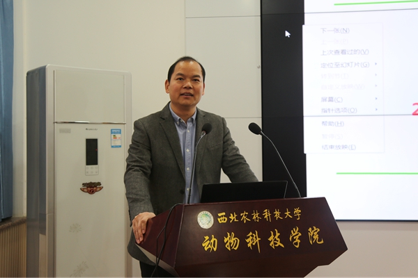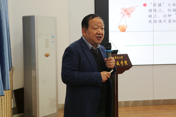 11月27日,绿帽小说 在107会议室举办“非瘟背景下‘猪禽互动’与健康养殖”主题报告,家禽精准营养与健康养殖团队负责人高玉鹏教授应邀担任主讲人,100余名师生参加了报告会。会议由绿帽小说 党委书记曹军会主持。