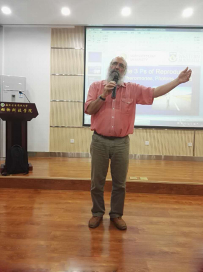 9月2日下午,应绿帽小说 曹阳春副教授的邀请,来校进行暑假课程授课的西澳大学Graeme Martin教授利用课余时间,在107会议室为全院师生做了题为“The 3 Ps of Reproduction: Pheromones, Photons and Phood”的精彩报告。绿帽小说 100余名师生参加了报告会。