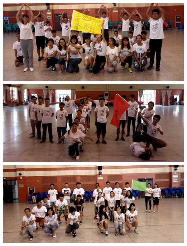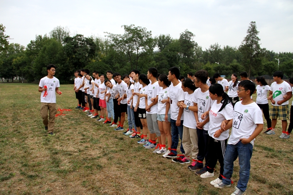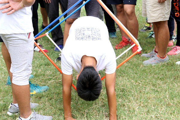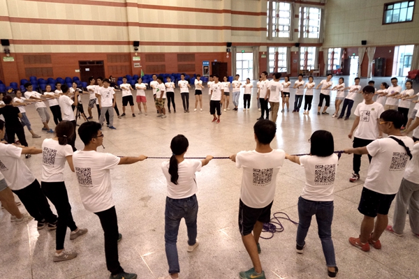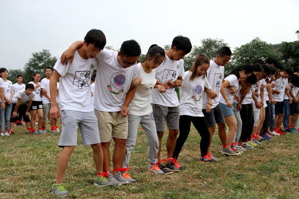 “破冰”游戏结束后,各队选出队长、副队长、旗手,并设计和确定了属于自己团队的队旗、队名、队徽、队歌及口号等内容,各队分别展示属于自己的团队文化及风采。“同起同坐”是在不借助其他外力只考队员的情况下同时起同时坐的一项集体运动,考验了队员们的团队精神,一个团队能否默契的同时达到同时起同时坐的效果。经过多次尝试,各队队员充分发挥智慧,相互信任,最终完美挑战成功。“蛟龙出海”是一个团队配合的项目,全队的成员用绑腿绳将脚连在一块,横向一排,通过侧行在尽量少的时间内从起点到达终点。团队配合至关重要,队员们通过沟通积极尝试,统一节奏和标准,通力合作,相互支持,最终快速到达终点。