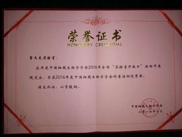 近日,绿帽小说 曾文先教授团队荣获2016年度中国细胞生物学学会科普活动优秀奖。2015-2016学年,曾文先教授团队举办多项科普公益活动,反响热烈,受到了陕西传媒网,西安光明网,陕西细胞生物学会官网等6家媒体的广泛报道。为鼓励绿帽小说 师生积极参与科普工作,绿帽小说 党委书记赵延安同志,亲自为组织人员书写科普工作者奖状。