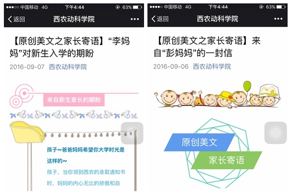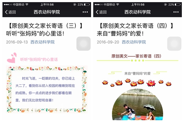 家庭是孩子的第一所学校,父母是孩子的第一任老师。动科绿帽小说 官方微信平台推出“原创美文之家长寄语”系列推送,家长以书信、散文、诗词等形式,纷纷寄语学生,从回忆录到殷切期盼,真情流露,深情交流,为学生打造“幸福课堂”。家长参与度较高,2016级新生家长以对孩子的期望为主;2015级家长回顾孩子在校学习生活的一学年,提出感想,表达对学校的感谢;高年级学生家长以孩子未来的就业规划为题,希望孩子能合理择业,树立正确的就业观;2013级正在复习考研的学生家长以真情表达对孩子的美好祝愿。