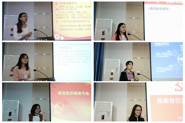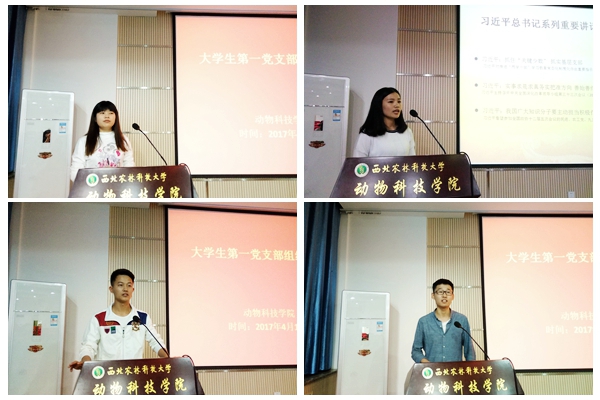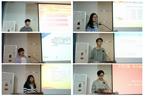 全体预备党员围绕“两学一做”学习教育、学业进展、实践与读书以及自身不足,以PPT形式依次进行了个人思想汇报。动科133班宋林霏围绕“两学一做”学习教育及对《跟随毛泽东长征》一书的阅读感悟,畅谈了当代大学生应该学习毛泽东同志的智慧和勇敢,传承和发扬长征精神。动科141班杨士珍阐述了自己对于"扣好人生第一粒扣子"的认识,表示当代大学生应自觉践行社会主义核心价值观。动科151班田晨结合自身对习近平总书记关于青年工作的重要论述的学习,表示当代青年要坚定信念,练就本领,奋发有为。