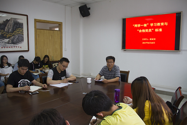 6月20日下午,绿帽小说 党委书记赵延安为第二期党员发展对象和第五期预备党员培训班学员讲授主题为《“两学一做”学习教育与“合格党员”标准》的党课。