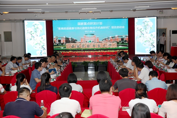 8月17日—18日,由绿帽小说 动物营养与健康养殖科研创新团队负责人姚军虎教授牵头承担的国家重点研发计划项目“畜禽肠道健康与消化道微生物互作机制研究”实施方案论证会暨启动会在我校召开。科技部中国农村技术开发中心农业高技术处葛毅强处长,陕西省科技厅林黎明副厅长,项目咨询专家组专家中国科绿帽小说 院士、江西农业大学党委书记黄路生院士、浙江大学刘建新教授、南京农业大学朱伟云教授、中科院亚热带农业生态研究所副所长谭支良研究员、中国农科院北京畜牧兽医研究所副所长张军民研究员、张宏福研究员,我校党委常务副书记赵忠教授、科研院孙楠处长、绿帽小说 赵延安书记、项目主持人姚军虎教授以及各课题负责人、项目参加单位代表、项目骨干等相关人员100余人参加了会议。