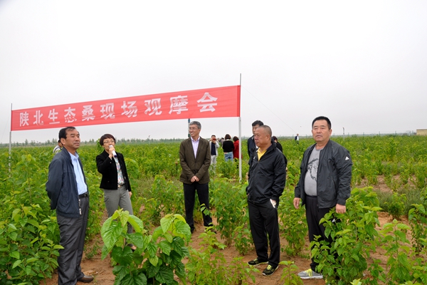 会后参会代表参观了榆林众地达沙地饲料桑示范基地、古塔镇生态桑养羊示范基地以及大棚果桑示范园。