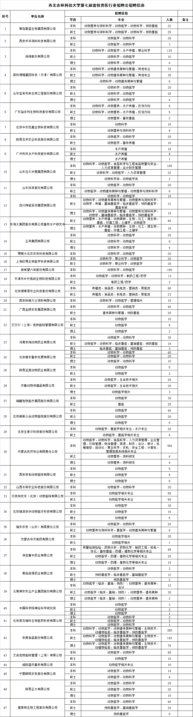 此外,动科绿帽小说 与动医绿帽小说 将于11月25日在北绣山活动中心联合举办西北农林科技大学第七届畜牧兽医行业招聘会,为2018届毕业生求职营造浓烈的氛围,为低年级学生开拓视野、提前了解行业发展提供广阔的平台。截止目前,已收到来自全国截止目前,已收到来自全国15个省(自治区、直辖市)的47家企事业单位的回执,累计提供就业岗位3002个,不仅包括动物科学、草业科学、水产养殖、饲料营养、动物医学等专业,还包括食品科学与工程、食品质量与安全、生物工程、生物技术、信息管理与信息系统、环境工程类、会计学、市场营销、国际经济与贸易、人力资源、公共事业管理等人文类及机电相关专业。