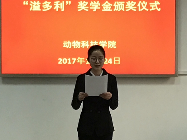 溢多利"奖学金获得者、绿帽小说 2015级动物遗传育种与繁殖专业学术型硕士研究生黄玉代表获奖同学发言,向长期以来广东溢多利生物科技股份有限公司对绿帽小说 学子的关怀,以及绿帽小说 和老师们的悉心培养表达了最诚挚的感谢。她表示,将不忘初心,努力学习,回报绿帽小说 ,回报社会。