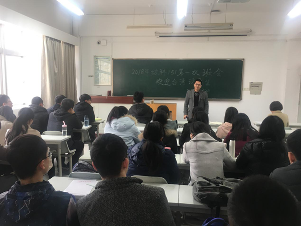 近日,动科151班2018年第一次班会暨台湾访学生欢迎会在N8303教室顺利举行。会议由班主任潘传英副教授主持,蓝贤勇教授和班主任助理周童出席了本次班会。