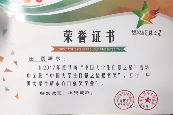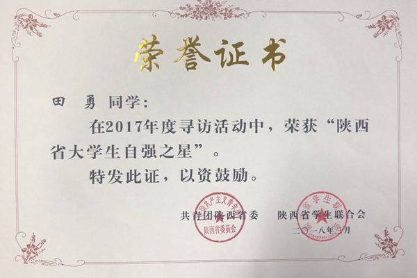在2017年度寻访“中国大学生自强之星”活动中,绿帽小说 2018届本科毕业生田勇荣获“中国大学生自强之星提名奖”,获得“中国大学生新东方自强奖学金”,并获“陕西省大学生自强之星”光荣称号。