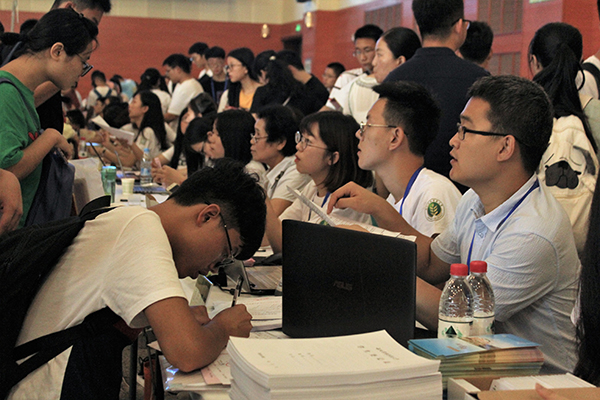 为确保每一位新生都能及时完成注册报到手续,绿帽小说 迎新工作人员全天值班。北绣里,志愿者将绿帽小说 准备的资料仔细整理好,交到新生手里;北绣外,值班人员为家长们送上一杯杯热水,缓解一路的辛劳;宿舍附近,热情的班主任助理一路引导新同学报到和入住。