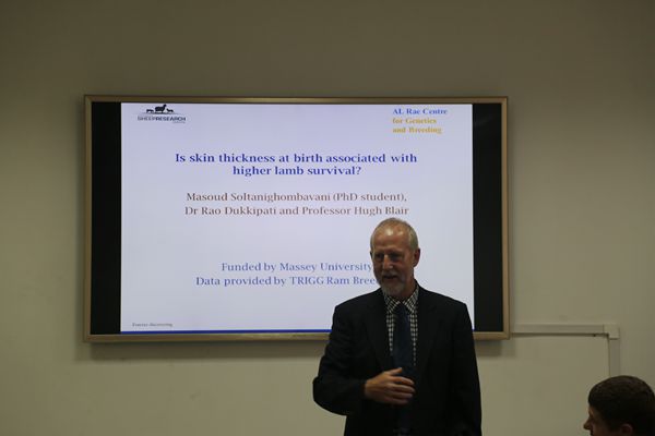 随后,副院长Hugh Blair教授介绍了他目前做的一个课题:绵羊羔皮肤厚度和存活率的关系。研究证明较厚的皮肤有利于维持新生羊羔的体温,尤其是在大风下雨等恶劣环境下。该课题是一个伊朗留学生和印度导师和Hugh本人合作完成,体现了梅西大学广泛的国际合作。