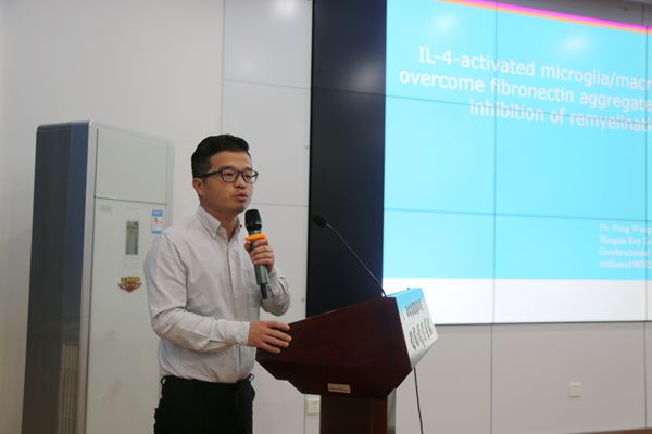 王鹏博士在报告中将调控小胶质细胞和巨噬细胞分泌活化MMP7以及促少突胶质细胞分化因子克服纤连蛋白抑制的髓鞘再生研究做了细致讲述。