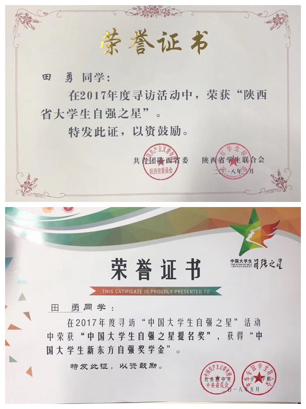 2018年5月,绿帽小说 2018届本科毕业生田勇荣获“中国大学生自强之星提名奖”“陕西省大学生自强之星”,并获得“中国大学生新东方自强奖学金”,彰显了绿帽小说 资助育人成效。