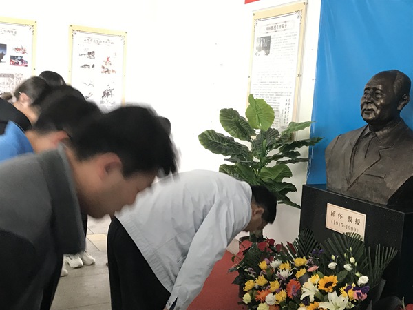向邱怀先生塑像鞠躬致敬