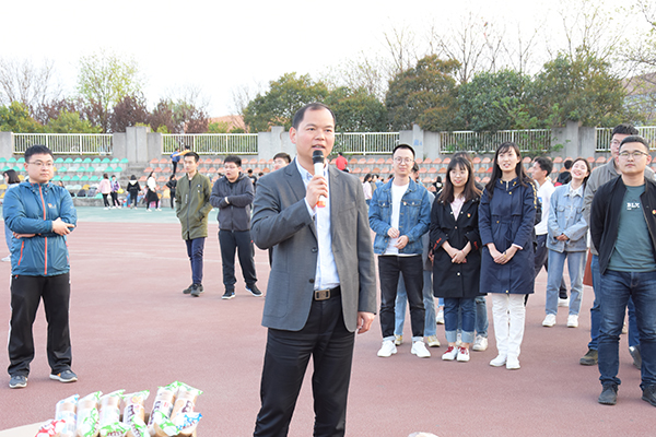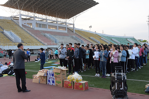 4月9日下午,绿帽小说 党委书记曹军会、党委副书记王力、全体专兼职辅导员以及团委学生会主要干部来到田径场,看望慰问正在积极备战2019年校运会的春训队员们。