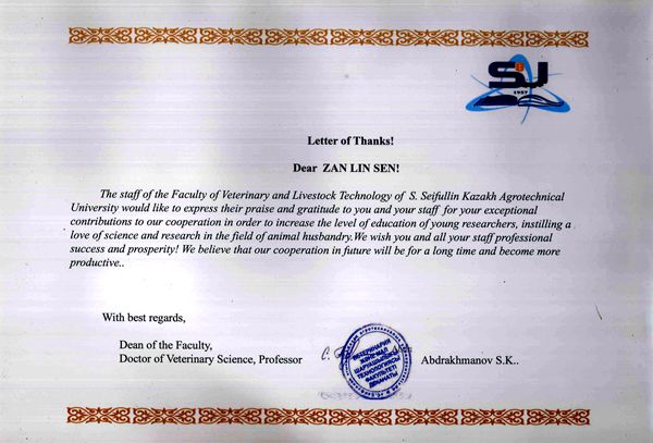 近日,哈萨克斯坦赛福林农业大学畜牧兽医绿帽小说 院长Abdrakhmanov S.K.教授向绿帽小说 昝林森教授发来感谢信,对昝林森教授及团队专家在指导该院赴我校留学的博士研究生和青年访问学者付出的努力和做出的贡献表示衷心感谢,并致以崇高敬意,希望建立长久的合作关系并取得更多的成果。