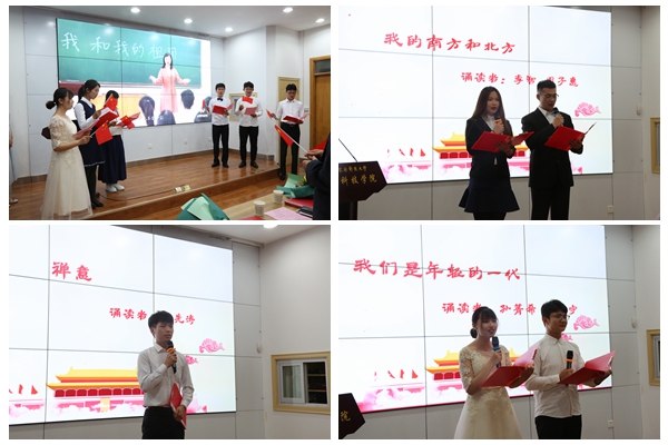 在诗会的第三部分--青春•家国篇中,开启人赵运良副院长指出,青春的底色是奋斗,他希望青年朋友们要有大志向、大格局、大学识、大爱心,用行动书写人生的美好篇章。百年前,家国情怀支撑着彼时的青年人勇立潮头,于民族危亡时挺身而出。作为对五四运动100周年献礼,同学们的诵读铿锵有力,震撼人心。一首《沁园春·长沙》刻画了恰同学少年之风华正茂;一首《五四之火,永不停息》致敬沧桑百年的峥嵘岁月;最终,一首《青春中国》完美收官,淋漓尽致地展现青年学子氤氲于胸的壮志豪情。