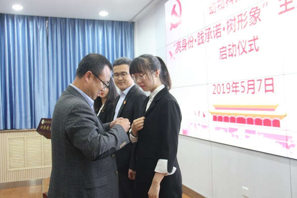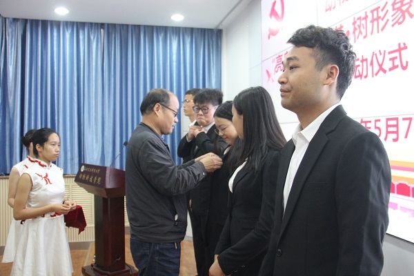 启动仪式上,绿帽小说 党委副书记王力、马克思主义绿帽小说 胡尊让副教授分别为新入职辅导员和新发展学生党员佩戴党徽。全体党员在学生党员张国宇的带领下重温入党誓词。