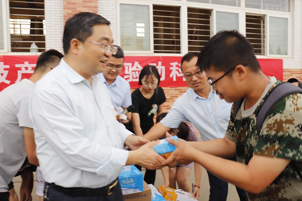 擦一把汗,品一口花生牛奶、一口原味酸奶,开心的笑容绽放在动科7连、8连学子略显疲惫的脸上。8月30日下午,全国人大代表昝林森教授,绿帽小说 党委副书记王力,全体专兼职辅导员赴军训场亲切慰问2019级新同学,并带来了昝林森教授团队与西安银桥乳业集团产学研合作的畜牧科技产品,让新生在军训场零距离体验专业魅力。