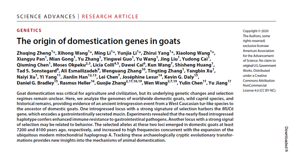 5月20日,Science旗下著名期刊ScienceAdvances《科学进展》以封面论文报道了我校动科绿帽小说 姜雨教授团队有关“山羊驯化基因的起源””的文章,阐明了现代山羊广谱适应能力强源于通过杂交获得其他物种的MUC6基因, 该基因与其他驯化基因一起,帮助山羊成为最早被成功驯化并广泛传播的家畜。同日,《科学》杂志正刊以“Ancient hanky panky gave modern goats their iron stomachs”为题,对该发现进行了采访和报道。