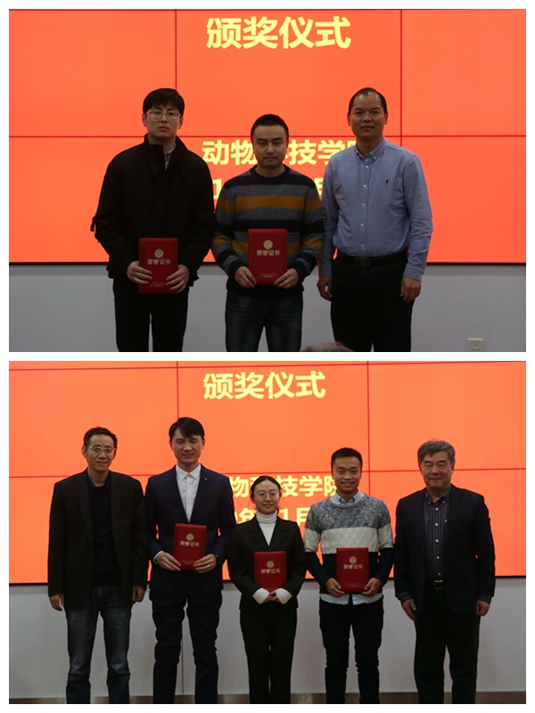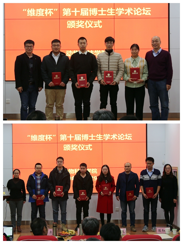 最终根据专家组的现场打分,四川农业大学基础兽医专业刘韬、我校水生生物学专业胡洋荣获一等奖;扬州大学动物遗传育种与繁殖专业靳锴、中国农业大学动物遗传育种与繁殖专业高磊、我校动物遗传育种与繁殖专业李欣憶荣获二等奖;我校动物遗传育种与繁殖专业夏博、我校水生生物学专业朱松、我校动物营养与饲料科学专业申静、华中农业大学水产养殖专业陈光辉荣获三等奖。