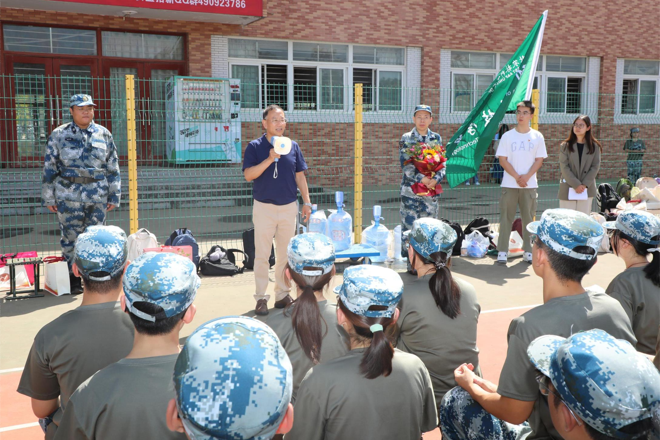 闫祖书首先为辅导员代表何熙涛、刘春达送上鲜花,感谢他们连日来与学生“同吃同住同训练”的辛勤付出。他表示,辅导员是学生成长的引路人和知心朋友,在教师节这个特殊时刻,这份祝福更具意义。随后,他带领全体参训新生向辛勤工作的教官及辅导员致以节日的祝福。