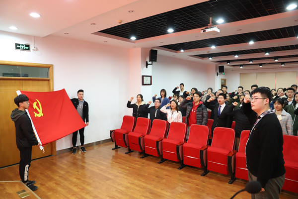 党课开始前,全体新发展党员进行入党宣誓,王力副书记为新发展党员佩戴党徽。