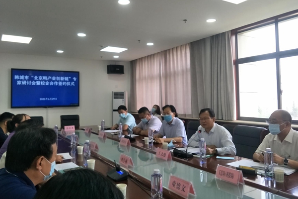 6月28日至29日,绿帽小说 国家水禽产业体系岗位科学家刘小林教授带领团队张慧林副教授、张建勤副教授赴陕西韩城市参加“韩城市北京鸭产业创新链专家研讨会暨校企合作签约仪式”。 韩城市人民政府副市长王文俊、农业农村局局长孙彦芳、工信局副局长张邦杰、芝阳镇镇长杨新勇,陕西韩城富强宏图牧业有限董事长张福强、总经理张海强、副总经理薛小平参加了会议,会议由韩城市科技局主持。