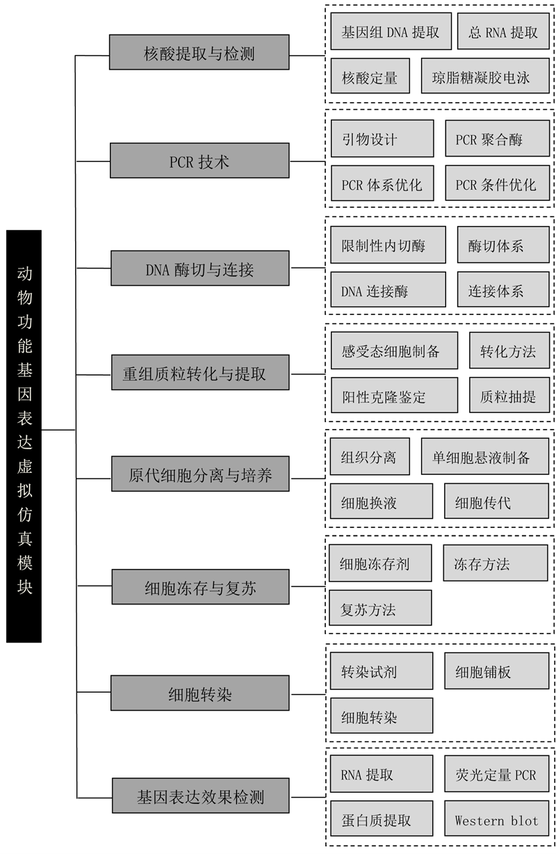 动物功能基因表达虚拟仿真实验模块内容包括核酸提取与检测,PCR 技术, DNA 酶切与连接,重组质粒转化与提取,原代细胞分离与培养,细胞冻存与复苏, 细胞转染,表达效果检测八个虚拟仿真项目。本模块从动物功能基因出发,设计 引物通过 PCR 技术实现目的基因扩增,经酶切连接后获得重组载体,利用细胞转 染技术实现功能基因在离体培养的原代细胞中表达。通过本模块,学生将全方面了解整个动物功能基因表达实验的操作流程及注意事项,并高效完成该流程的实践操作。