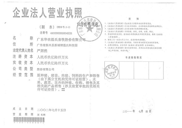 广东华农温氏畜牧股份有限公司是在原广东温氏食品集团养猪公司基础上,由广东温氏食品集团、华南农业大学科技实业发展总公司、新兴食品集团有限公司等于2002年7月共同出资发起成立的,以种猪育种和肉猪生产为主的专业化公司。公司注册资本6.4亿元,现有员工8000余人,其中大专以上学历科技管理人员600余人。截至2010年底,公司总资产达25亿元。