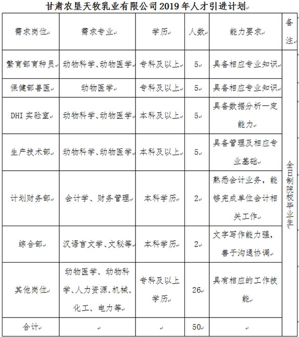 高等院校本科及以上学历应往届毕业生20名,畜牧、兽医专科及以上学历应往届毕业生30名。需求专业和引进人数详见《甘肃农垦天牧乳业有限公司2019年人才引进计划》。