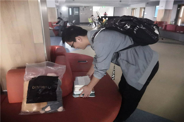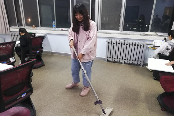 由纪检部学生干部作为负责人, 分配任务并带头工作,对八号教学楼7层的讲台、课桌、窗台、地面进行清扫和摆放整理,以及对研究生自习室进行清扫。晚上10:00,全体阳光团员准时集合到达指定地点,自行带好抹布、扫帚、拖把等清洁工具。清扫过程中,同学们不放过教室的任何一一个角落,地面干净、讲台整洁、桌椅整齐,整个教室焕然一新。