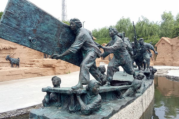 雕塑园总体是一个类似三道弯的结构,其中的雕塑靠在道路两旁的墙上,背景整体上是黄土房屋,衬墨色雕像,形象地展现了沂蒙地区战时的峥嵘岁月。